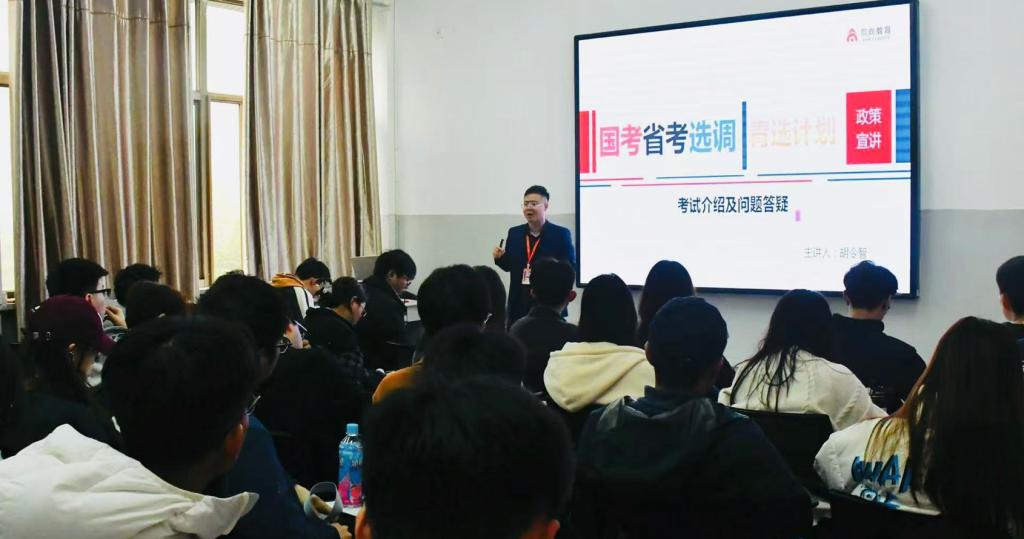 在燕山校区举办了国考、省考及青选计划公益讲座,邀请向尚教育讲师胡令智为高年级学生做考公方面的政策解读。来自大二至大四的50余名学生参加了本次讲座。讲座由捕鱼达人