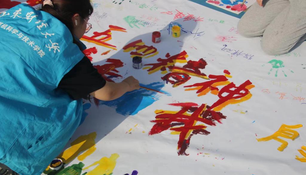 最美人间四月天,阳光热烈,喷泉洒洒。国旗下校徽前,学生们铺开20米画卷,言化为行,用画笔一笔一划描绘自己眼中的“青春财大 魅力计科”,立下“五四精神 传承有我”的铮铮誓言,践行“奋斗正当时 青春勇担当”的时代宣言。
