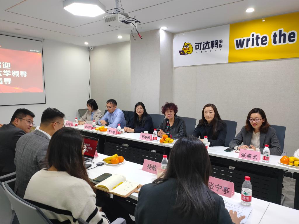 党委书记杨春丽,党委副书记吕海霞、李云枝,就业办主任李珊珊,团委书记李晨露,专业教师崔超然、张春云及学生代表一行,实地走访了山东可达鸭教育科技有限公司,双方在实习、就业、竞赛等相关领域达成共识。