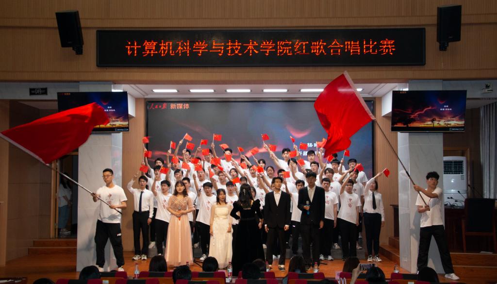 伴随着优美的旋律、激情昂扬的朗诵,由计科2003班《歌唱祖国》拉开了整场比赛的序幕。歌颂与唱完美结合的《少年中国说》,由金信2001班演唱,这首歌曲风尖锐,节奏激昂,历史奔流,永不回溯。人工智能2001班演唱《国家》,学生在歌声中翩翩起舞,为大家带来视觉与听觉的双重享受。千载而下,涛声依旧,只留下了无数闪光的名字及不朽的篇章,一百多年后的今天,中华经典的铿锵音韵仍在我们耳边回响天地苍苍。比赛中,各方队采用了新颖的队形,融入了舞蹈以及器乐,激昂的歌声和极具风采的创意设计赢得了评委和观众们的热烈掌声。