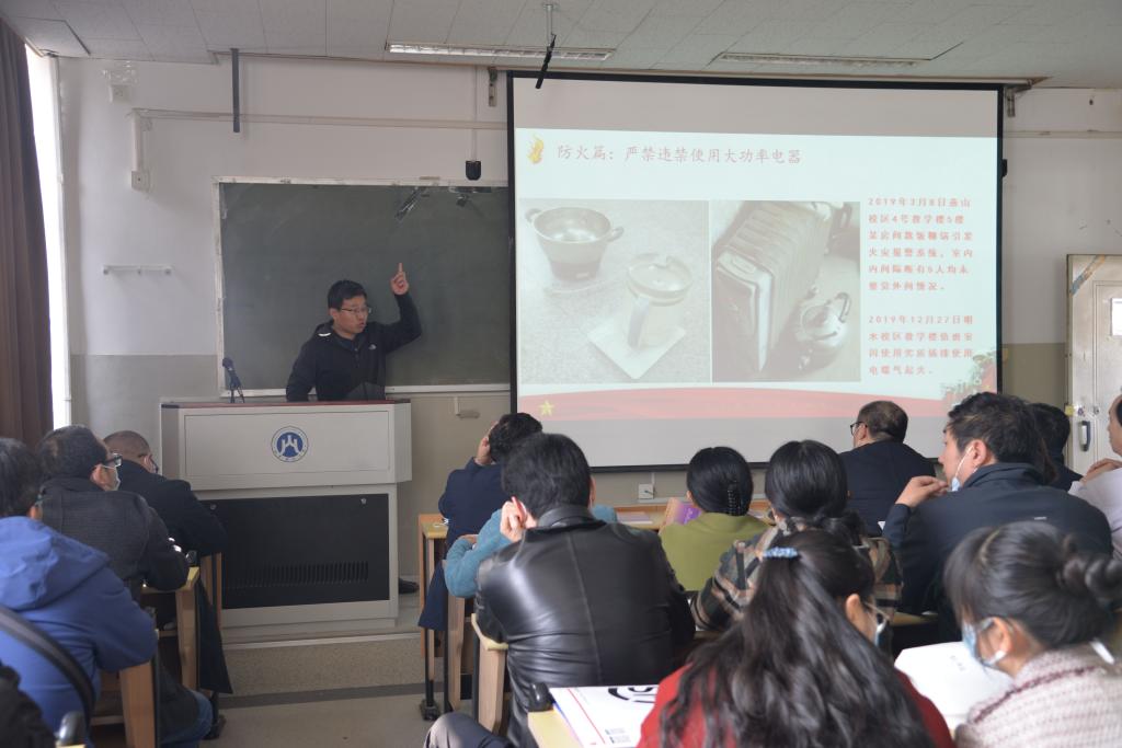 2021春季消防安全专题培训会。党委保卫部(安全管理处)副部长赵勇面向全体教职工及学生代表100余人做了消防安全专题讲座,培训会由院长韩慧健主持。