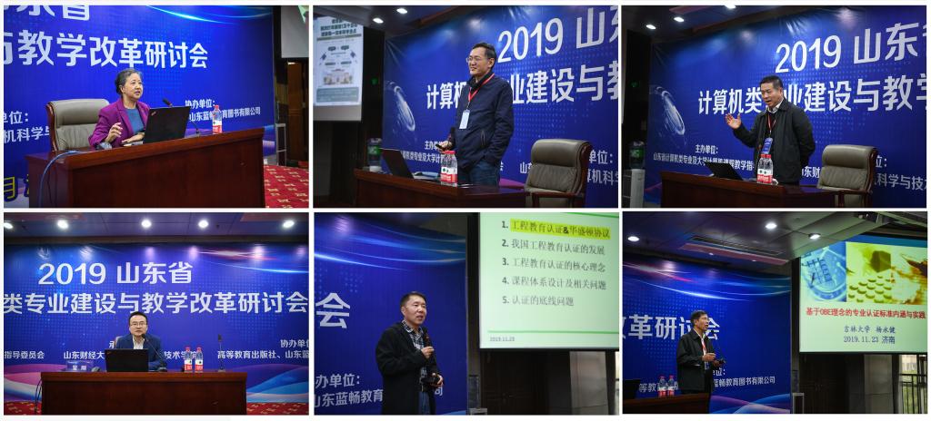耿玉水首先对山东省计算机类专业及大学计算机课程教学指导委员会的成立表示祝贺,并介绍了山东省计算机类专业及大学计算机课程教学指导委员会成立的背景和在计算机高等教育中的作用,对如何进一步发挥教指委的监督与指导作用提出了建设性意见。来自北京航空航天大学、哈尔滨工业大学、北京交通大学、吉林大学、西安交通大学等高校的教育部计算机教学指导委员会资深专家、国家级教学名师、工程教育认证专家围绕课程体系规划、教材设置、实践教学环境建设、在线慕课建设、混合式教学、翻转课堂、OBE教育理念、工程教育认证申报等方面做了精彩报告。