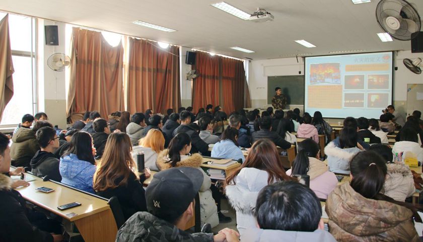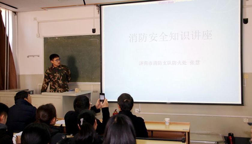消防教育专题讲座暨消防疏散演练活动在燕山校区举行,济南市消防支队法制科参谋张慧向捕鱼达人