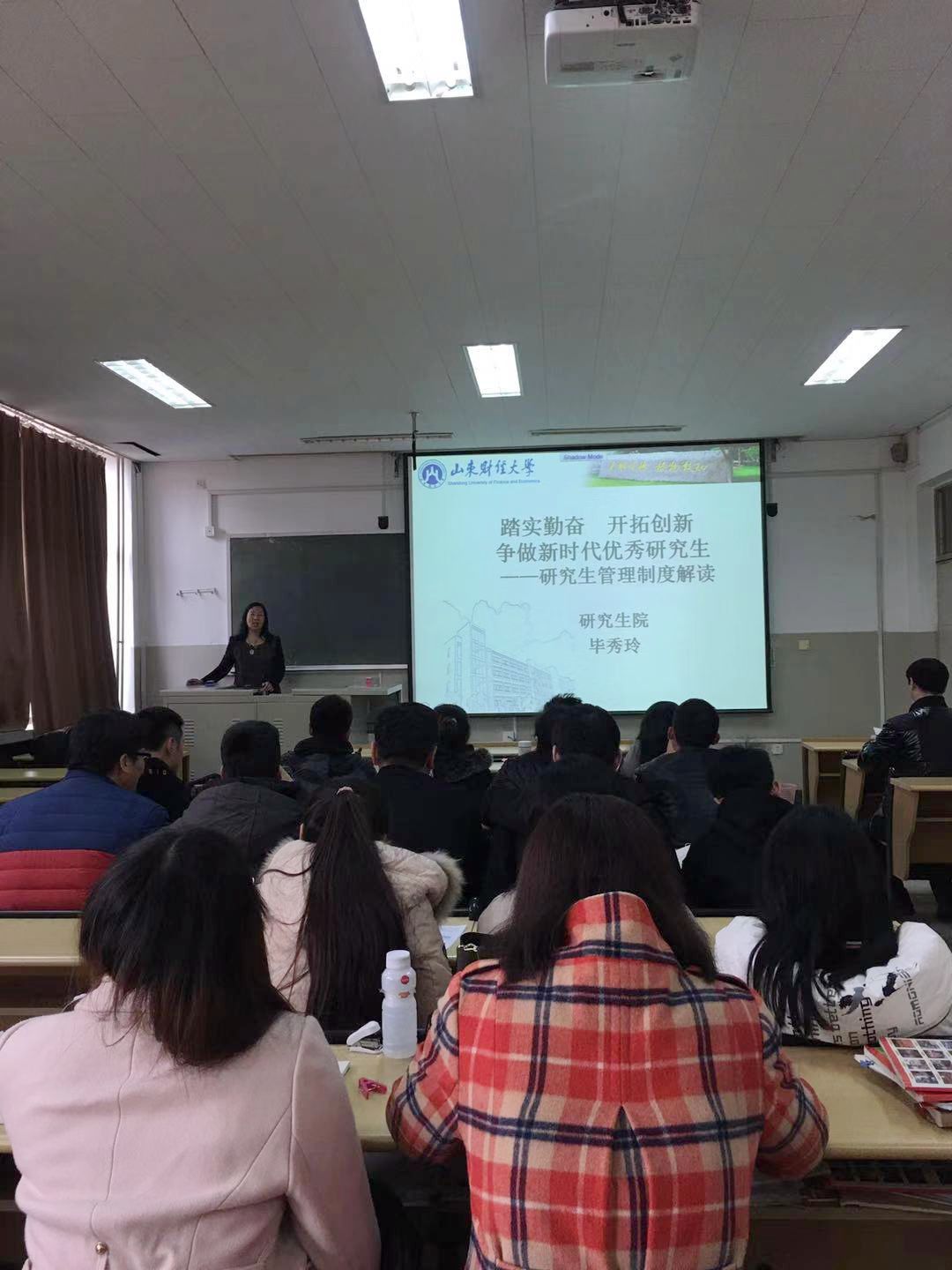 毕秀玲首先向同学们阐述了新时代研究生教育新要求,从国家层面、人民层面、民族层面、世界层面解读了新时代的内涵。毕秀玲在报告中指出高端人才培养关乎民族兴亡、关乎大国崛起和赶超、关乎人才强国制高点竞争、关乎中国科教结合体制潜在优势的发挥。然后,毕秀玲重点围绕研究生招生管理、课程学习、教育国际化、学术能力提升、学位管理以及奖助体系等,详细解读了我校研究生管理的各项制度,并强调了学术诚信对每个研究生的成长、成才的重要性。