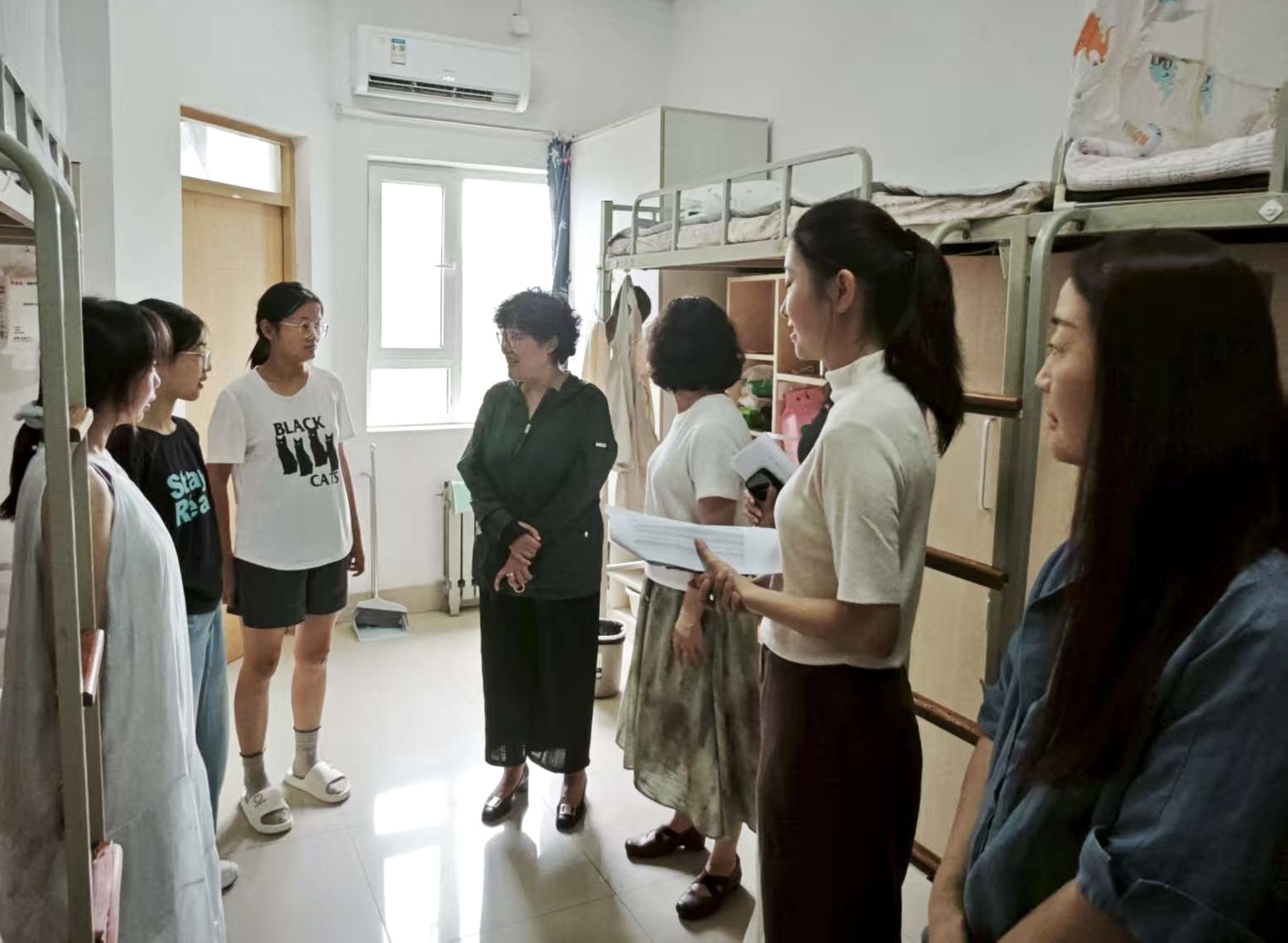 党委书记杨春丽、院长刘慧、党委副书记赵连幸、吕海霞及新生辅导员任楠、潘云默、郑雅馨一行深入新生宿舍,亲切看望刚刚入校的莘莘学子,为他们送去关怀与温暖。