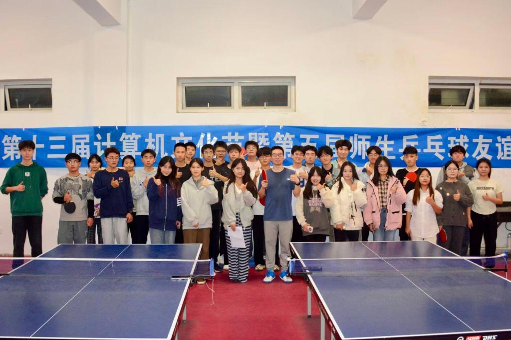 在热烈的氛围中,全体参赛选手与学生会文体部成员在“五育并举,‘码’力全开——第十三届计算机文化节暨第五届师生乒乓球友谊赛”的横幅前集体合影,镜头中,师生们神采奕奕,笑容灿烂,或竖起大拇指,或比起象征胜利的手势,眼中闪烁着对比赛的期待与自信。五彩的镜头不仅生动地记录了活动参与者的集体风貌,凝聚了昂扬的斗志,更为即将上演的精彩比赛定格了充满活力的瞬间。