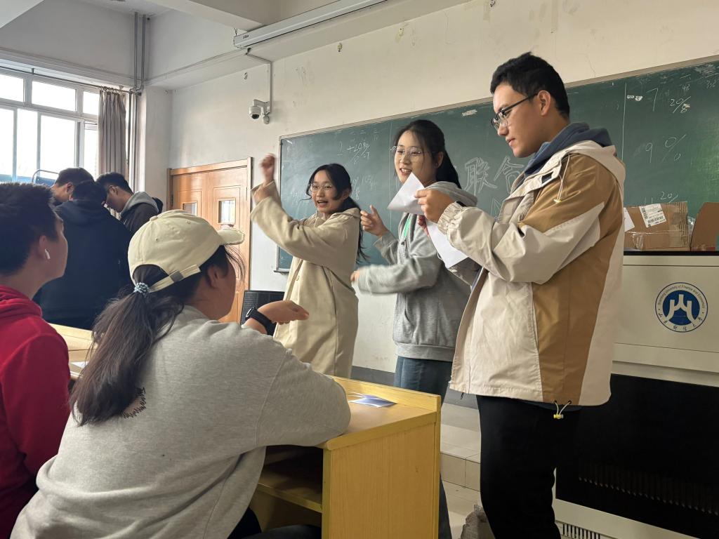 联合活动设置“绘画传递”“你划我猜”“纸条寻友”三大趣味环节,将协作性与互动性深度融合。在“绘画传递”环节,学子们以画笔为媒,在接力创作中展现丰富想象力与默契配合,“出其不意”的创意作品引发阵阵欢笑,拉近了学子们之间的距离;“你划我猜”环节中,比划者全力演绎、猜题者积极抢答,紧张热烈的氛围将活动推向高潮,充分展现了学子们的反应能力与团队协作水平;“纸条寻友”环节则以温情互动为核心,学子们通过纸条牵线搭桥,从陌生试探到坦诚交流,在轻松对话中播种友谊,传递青春温暖。