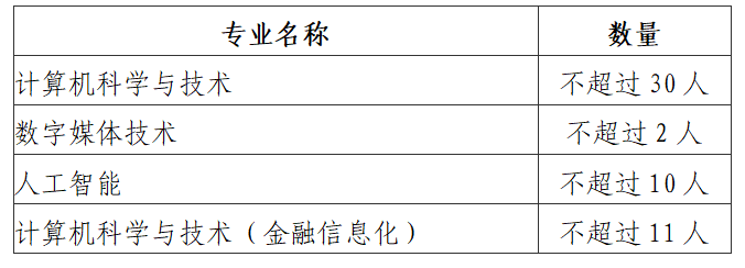 接受转专业学生的专业包括:计算机科学与技术专业、数字媒体技术专业、人工智能专业、计算机科学与技术(金融信息化),具体数量如下: