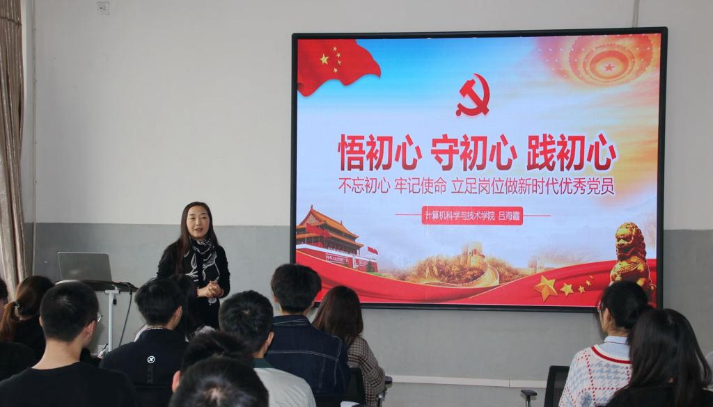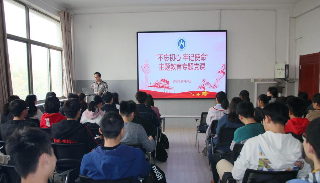 吕海霞作了《不忘初心 牢记使命 立足岗位做新时代优秀党员》的主题党课。她首先向同学们讲授了“什么是初心”,然后从“悟初心,坚持党领导一切的忠心”、“ 守初心,全心全意为人民服务的赤子之心”、“ 践初心,实现中华民族伟大复兴的信心”三个方面展开授课。吕海霞说,不忘初心,就是首先要坚决维护以习近平同志为核心的党中央权 威和集中统一领导。这是时代的需要、人民的共识,更是对马克思主义领导思想的坚持和继承。不忘初心,就是不忘出身本来,始终站稳人民立场。对校大学生来说,“不忘初心,牢记使命”就是在以习近平同志为核心的党中央坚强领导下,深入学习贯彻习近平新时代中国特色社会主义思想,切实增强“四个意识”,坚定“四个自信”,坚决做到“两个维护”,践行落实党章党规党纪,立足岗位做贡献。最后,吕海霞向同学们发出呼吁:作为新时代的青年,应志存高远、忠于祖国,努力做新时代具有远大理想和坚定信念的爱国者;作为新时代的青年,应敢于担当、勇于奋斗,努力做新时代具有责任意识和创新精神的建设者;作为新时代的青年,应勤奋学习、锤炼身心,努力做新时代具有过硬本领和高尚风格的接班人。