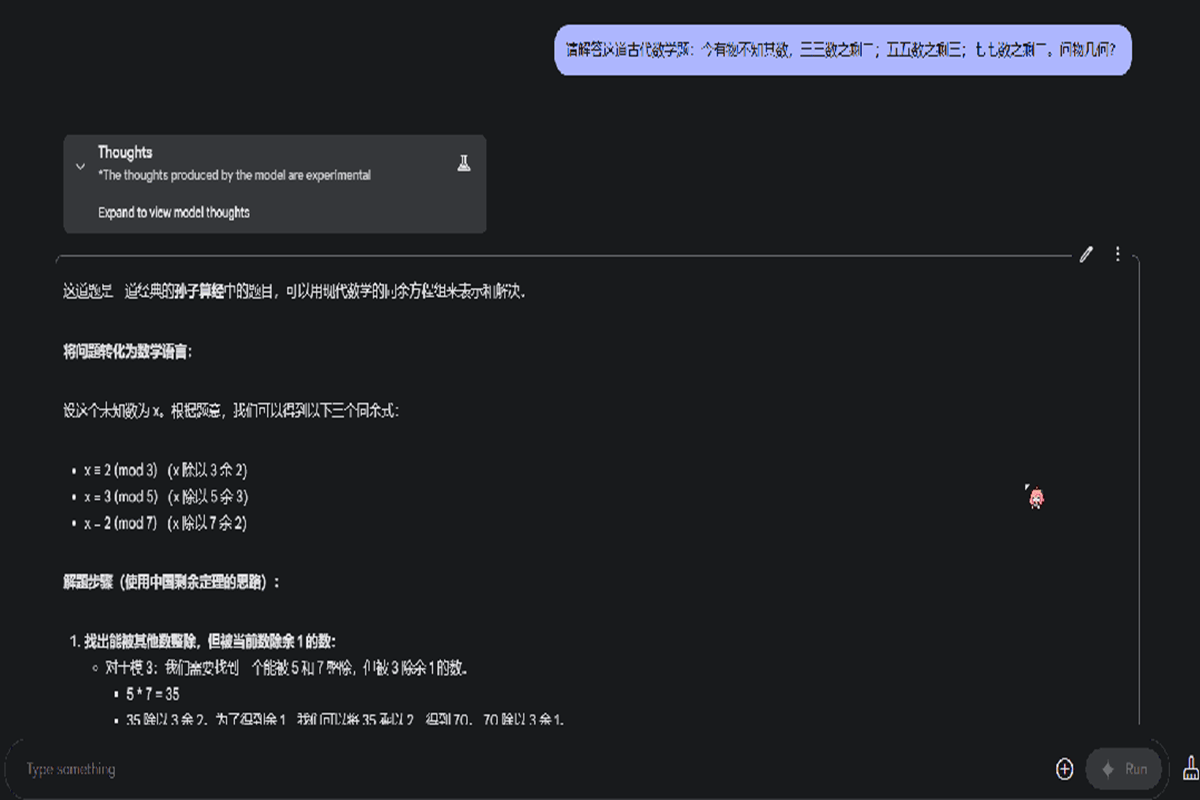 12月,谷歌推出了Gemini 2.0 Flash Thinking,这一模型以透明推理能力著称,能够清晰展示其推理过程,这与传统AI模型直接输出结果的方式形成对比。这种透明推理的能力为用户提供了直观的AI思维路径展示,是AI技术的一个重要创新。