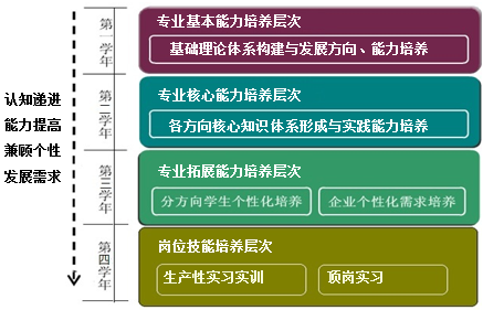 基于上述特色,本专业对每门课程均细化其培养目标与可达成的能力标准,并以此为基础构建了科学、系统的递进式课程群。该课程群涵盖专业基础类、专业核心类、专业拓展类以及综合应用类四大模块,形成了“面向产业需求、突出专业特色、强化应用实践、鼓励交叉创新”的完整培养路径。